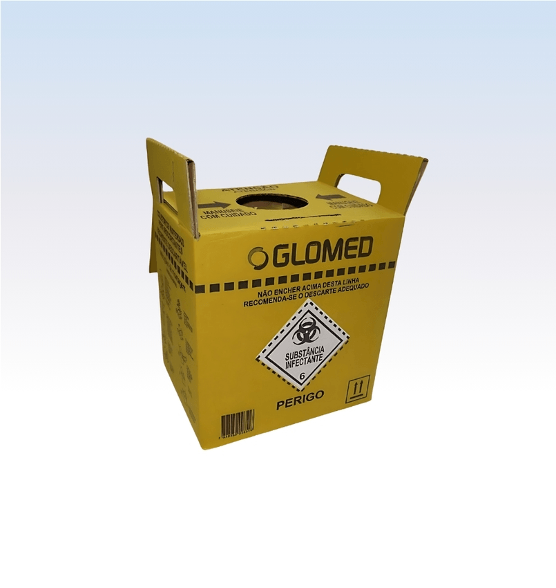 Descrição: O Coletor de Material Perfurocortante é um dispositivo feito de papelão resistente, projetado para a coleta segura de objetos cortantes, como agulhas e bisturis. Possui uma abertura na parte superior para inserção dos materiais, uma tampa que pode ser lacrada e indicadores de preenchimento. Sua base é estável para evitar tombamentos, e vem com instruções de uso para garantir a segurança durante o descarte.