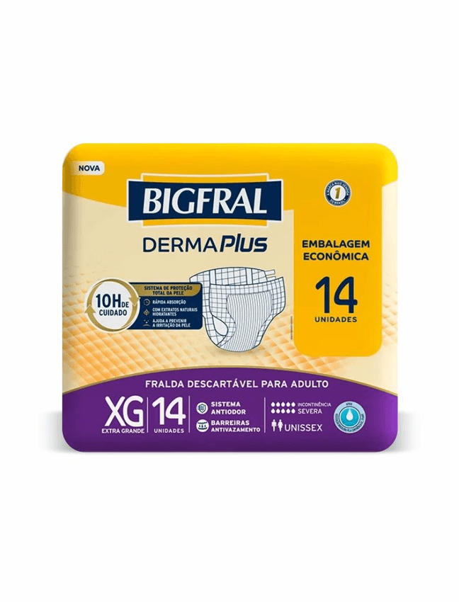 Descrição: A Bigfral DermaPlus foi desenvolvida para adultos com incontinência urinária severa. Possui o exclusivo sistema de proteção total da pele, com extratos naturais hidratantes que ajudam a prevenir irritações, mantendo a pele protegida e saudável, além de sistema antiodor, trazendo até 10h de proteção e cuidado.